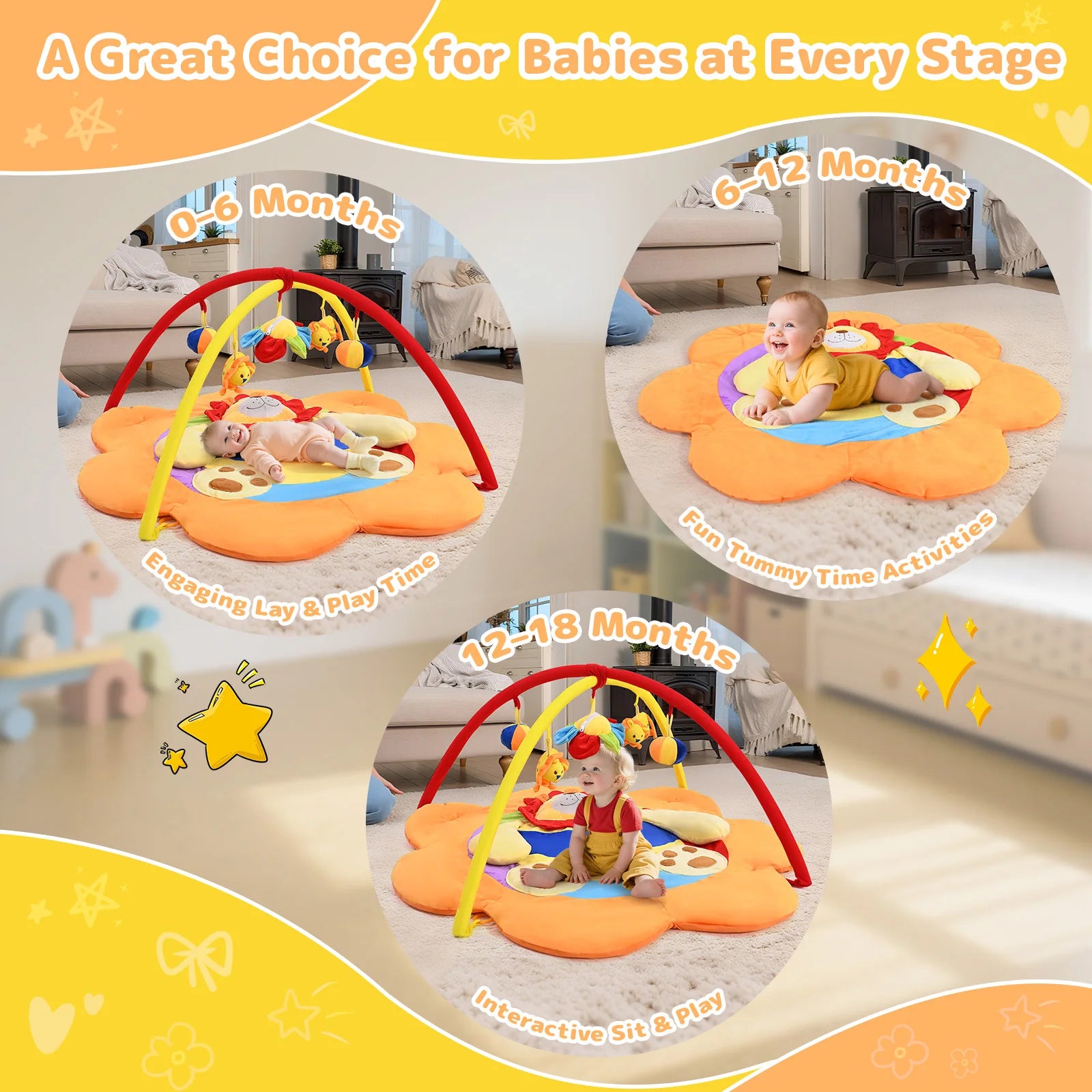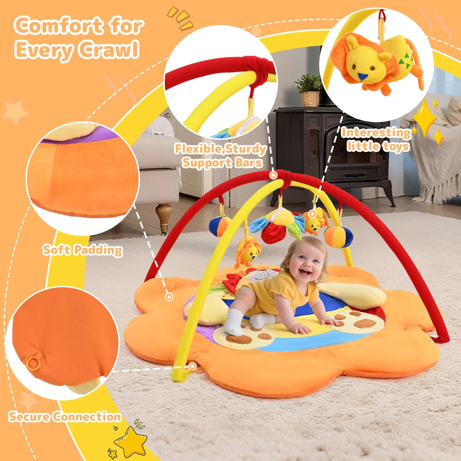 Rbefeuly baby lekmatta (95×95×52 cm) följer ditt barns utveckling – från magläge till krypning och lek. Mattan inkluderar 5 roliga leksaker som främjar motorik och lärande, samt en mjuk, stoppad yta med lejonmönster för säker och bekväm lek. Enkel att vika, rengöra och perfekt för både hem och resor.